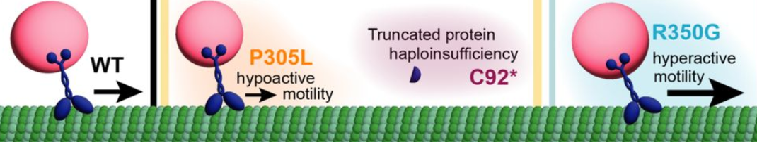 Mutations like P305L produce a motor that still moves along microtubules, but not as well. KIF1A doesn’t get cargo to where it needs to go, and may block traffic for other motors as well.