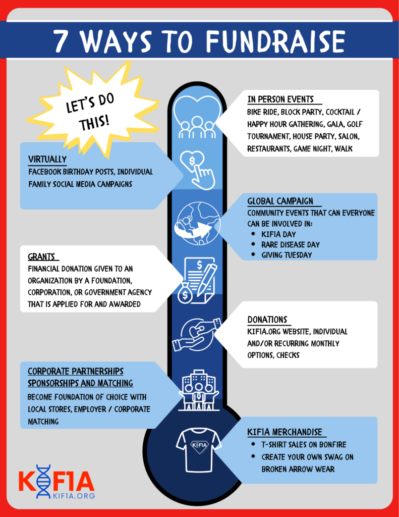 You can help us achieve our mission faster by fundraising for KIF1A.ORG. Below we have listed all the ways KIF1A.ORG receives donations. From donating your birthday to KIF1A.ORG to hosting a silent auction event, there are plenty of opportunities for you to get involved in our 7 ways to fundraise.